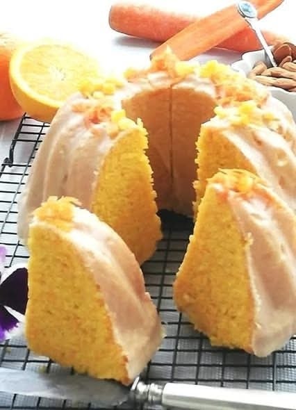 Obłędna babka marchewkowa z dodatkiem migdałów i o smaku pomarańczowym. Marchewka dodaje jej złotopomarańczowego koloru i wilgotności.
