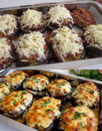 Skrop połówki oliwą z oliwek, posól i popieprz według uznania. Ułóż bakłażany na blasze wyłożonej papierem do pieczenia i wstaw do nagrzanego piekarnika na około 30 minut. Piecz do momentu, aż miąższ stanie się miękki i delikatny.