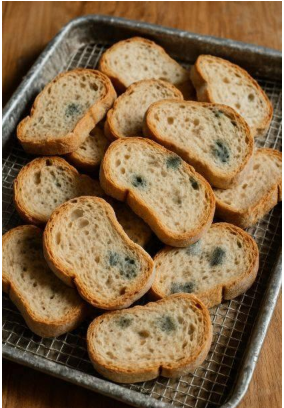 Czerstwy chleb jest zazwyczaj jadalny, pod warunkiem że nie pojawiła się na nim pleśń. Pleśń może przybierać postać zielonych, czarnych lub białych plam, czasem o puszystej strukturze, i często towarzyszy jej charakterystyczny, nieprzyjemny zapach. Taki chleb należy bezwzględnie wyrzucić, ponieważ pleśń może wytwarzać mykotoksyny szkodliwe dla zdrowia.