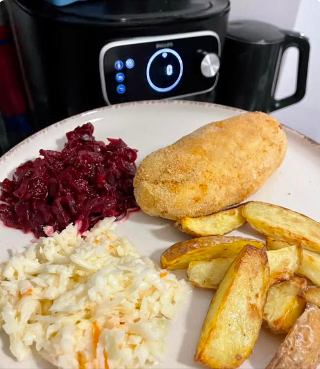 Dzięki waszym wcześniejszym poradom udało mi się dzisiaj przygotować idealnego devolaya z AF ❤️ Kotlet przygotowałam tak jak doradzaliście, czyli z mięsa mielonego. Użyłam 400 g i zrobiłam dwa duże kotlety 🤤 Przyprawiłam solą i pieprzem. Najpierw na płaski placek z mięsa wyłożyłam duży kawałek masła z zamrażarki (wrzuciłam wcześniej dosłownie na 10 minut) i wilgotnymi rękami uformowałam kotlet, domykając masło mięsem z każdej strony. Obtoczyłam najpierw w bułce tartej, następnie w jajku i znowu w bułce. Owinęłam ciasno folią spożywczą i na ok. 15 minut do zamrażarki. Popsikałam z każdej strony oliwą, piekłam przez 20 minut w 170 stopniach, następnie 5 minut w 200 stopniach aby się ładnie przyrumieniły. Idealnie upieczony w środku, fajna panierka na zewnątrz. No i to masło, które wypłynęło dopiero po przekrojeniu 😍 Jem z upieczonymi wcześniej ziemniaczkami i zestawem surówek. Smacznego!