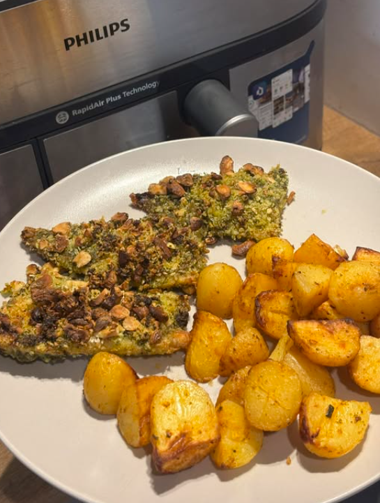 🐟 Dorsz w orzechowej panierce z zielonym pesto! Pomysł na obiad idealny. To połączenie chrupiącej, aromatycznej panierki, delikatnej białej ryby oraz świeżego sosu jogurtowego. Całość przygotujesz szybko w AirFryerze, dzięki czemu danie jest lekkie, a jednocześnie pełne smaku i tekstur. Złocista skorupka z orzechów i panko świetnie kontrastuje z soczystym wnętrzem ryby, a pesto nadaje całości intensywnego, ziołowego aromatu.