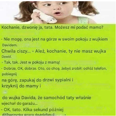 Pewien mężczyzna chciał za wszelką cenę porozmawiać ze swoją żoną i o coś ją zapytać. Tego ostatniego nie było w domu. Następnie sięgnął po telefon i wybrał numer, aby skontaktować się z żoną. Po kilku sekundach ktoś odebrał. To była mała dziewczynka. Ojciec zapytał go: „Cześć kochanie, dzwonię ja, tata…. Czy możesz mi podać mamo?”. W tym momencie dziewczyna dokonała przed nim czegoś, czego się nie spodziewał. Ona mu powiedziała: „Nie mogę, ona jest na górze w swoim pokoju z wujkiem Davidem”.