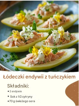 Danie to wyróżnia się nie tylko smakiem, ale również formą podania. Liście endywii pełnią rolę naturalnych „łódeczek”, dzięki czemu przystawka jest wygodna do jedzenia i estetycznie prezentuje się na talerzu. To propozycja idealna dla osób ceniących prostotę, świeżość składników oraz szybkie przepisy bez skomplikowanych technik kulinarnych.
