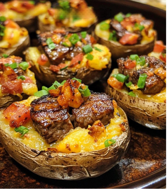 Faszerowane ziemniaki z pieca z kawałkami steka to sycące, aromatyczne danie, które łączy w sobie wszystko, co najlepsze w kuchni domowej: chrupiące pieczone ziemniaki, soczyste mięso wołowe oraz kremowe i wyraziste dodatki. To idealna propozycja na treściwą kolację lub weekendowy obiad, kiedy masz ochotę na coś naprawdę konkretnego i pełnego smaku.