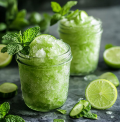 Granita z ogórka, limonki i mięty to wyjątkowo lekki, naturalny i niezwykle orzeźwiający deser, idealny na gorące letnie dni. Łączy w sobie świeżość ogórka, wyrazistą kwasowość limonki oraz chłodzącą nutę mięty, tworząc kompozycję, która doskonale gasi pragnienie i odświeża podniebienie. To propozycja nie tylko efektowna wizualnie, ale także bardzo prosta w przygotowaniu – bez gotowania i bez użycia skomplikowanych sprzętów.