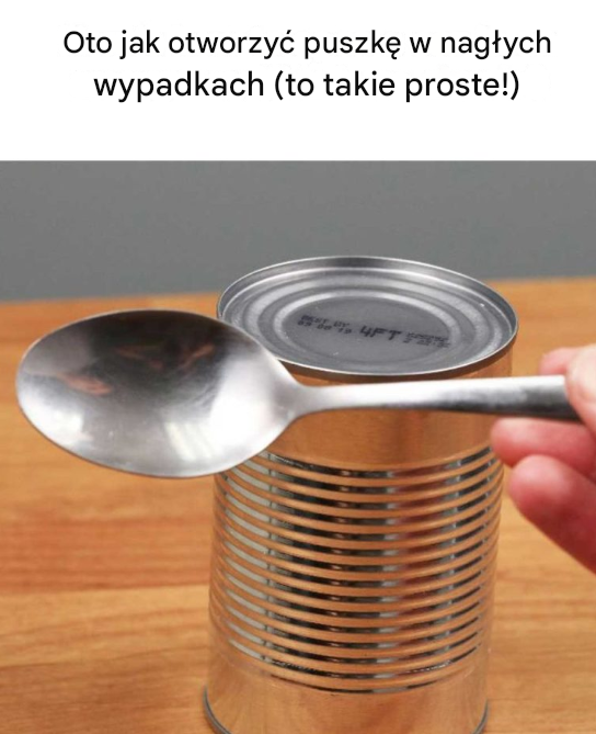 - Teraz wystarczy wsunąć łyżkę w krawędź i poruszać nią w lewo i w prawo, otwierając puszkę.