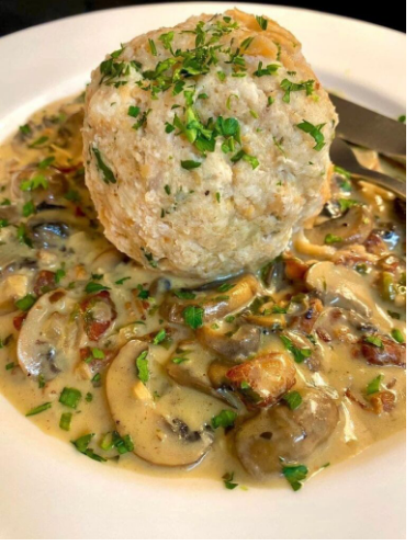 Knedle chlebowe doskonale wchłaniają sos, dzięki czemu każdy kęs jest pełen smaku. Kremowa konsystencja pieczarek, subtelna nuta białego wina oraz aromaty świeżych ziół tworzą harmonijną całość, która przypomina tradycyjne dania serwowane w alpejskich lub środkowoeuropejskich kuchniach.