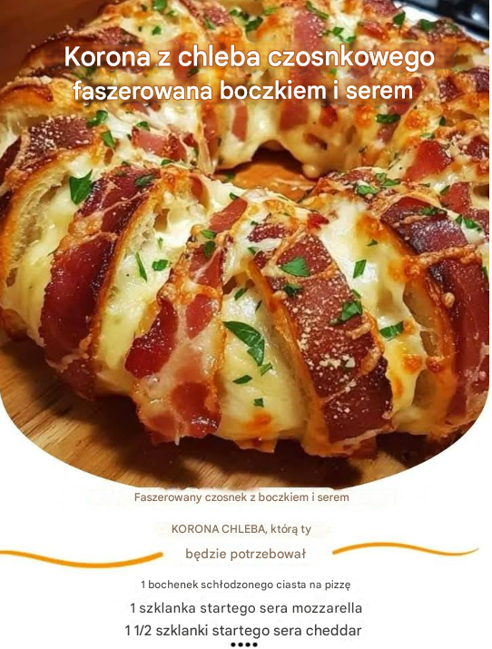 Ta chlebowa korona z czosnkiem, boczkiem i serem to przepis, który łączy w sobie wszystko, co najlepsze w kuchni comfort food. Jest efektowna, niezwykle aromatyczna i zaskakująco prosta w przygotowaniu. Idealnie sprawdzi się jako przekąska na spotkanie z przyjaciółmi, rodzinne przyjęcie, wieczór filmowy lub dodatek do wspólnego biesiadowania przy stole.