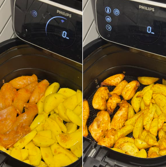Danie proste, więc i przepis nie będzie skomplikowany – polecam, jeśli ktoś chce szybko przygotować obiad bez zbędnego stania przy kuchni. Kawałki kurczaka i przyprawione łódeczki ziemniaczane pieką się razem w koszu airfryera, dzięki czemu całość nabiera aromatu, a ziemniaki wychodzą chrupiące z zewnątrz i miękkie w środku. To szybki, jednogarnkowy posiłek, idealny na codzień.