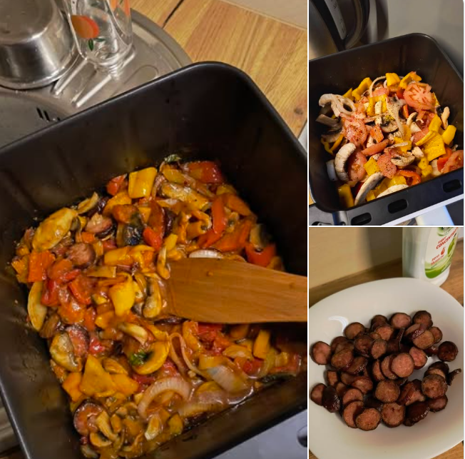 Leczo… Najpierw kiełbaska, żeby tłuszczyk się wytopił. Odsączony tłuszcz i do miski ląduje papryka, pieczarka, pomidor, cebula i czosnek. Kiełbaska 15 min 180°, warzywa 180° – 30 min (doprawiamy jak kto lubi). Potem dołączam kiełbaskę i szklankę passaty i 15 min 180° i jest mega!