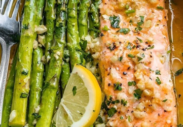 Łosoś pieczony w papilotach ze szparagami i sosem czosnkowo-cytrynowym