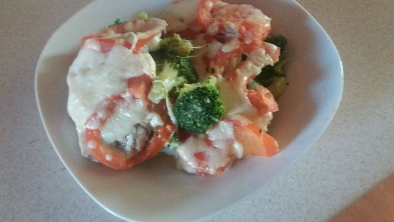 2. Do żaroodpornego naczynia wkładamy brokuły , a na nich układamy surowe filety z ryby , wcześniej skropione sokiem z cytryny i oprószone solą oraz tymiankiem. Rybę przykrywamy warstwą pokrojonych w plastry pomidorów, a całość posypujemy startą mozarellą.