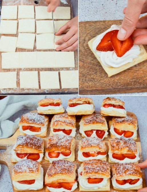 Ten deser zachwyca kontrastem tekstur – chrupiące, złociste ciasto łączy się z aksamitnym kremem i soczystymi truskawkami. Nie wymaga skomplikowanych technik ani długiego czasu przygotowania, a mimo to prezentuje się bardzo efektownie. To doskonały wybór dla osób, które chcą przygotować coś wyjątkowego bez zbędnego wysiłku.