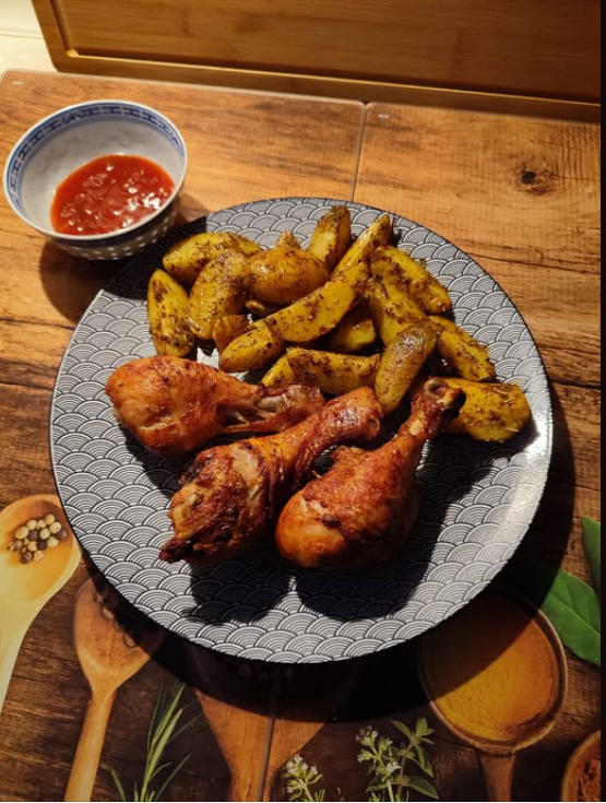 To bardzo prosty, domowy sposób na pełny obiad przygotowany w airfryerze. Udka doprawione ulubionymi przyprawami stają się miękkie, soczyste i przyjemnie zarumienione, a podgotowane wcześniej ziemniaki pieką się szybko i równomiernie, zyskując chrupiące krawędzie. Całość możesz uzupełnić świeżą salsą, która dodaje lekkości i balansuje smak intensywnie przyprawionego mięsa.