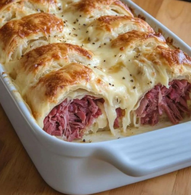 Torta di mezzaluna Reuben, znana również jako Reuben Crescent Bake, to sycąca, aromatyczna zapiekanka, która w kreatywny sposób przenosi smaki klasycznej kanapki Reuben do formy dania pieczonego. Połączenie maślanego ciasta do croissantów, delikatnej wołowiny konserwowej, ciągnącego się sera szwajcarskiego, kiszonej kapusty oraz sosu Thousand Island tworzy wyjątkowo wyrazistą i komfortową potrawę.