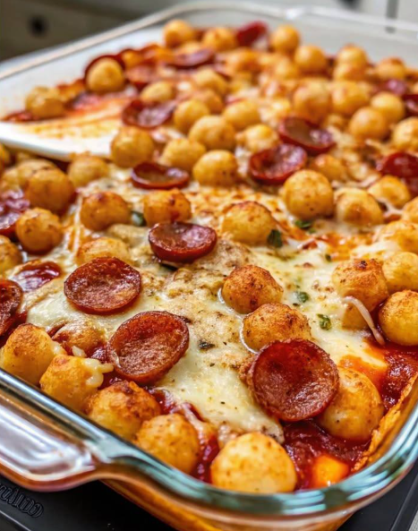 Sos pizza nadaje całości charakterystyczny, dobrze znany smak, roztopiona mozzarella wszystko spaja, a złociste tater tots na wierzchu dodają nieodpartej chrupkości. To połączenie sprawia, że zapiekanka znika z talerzy szybciej, niż zdąży wystygnąć.