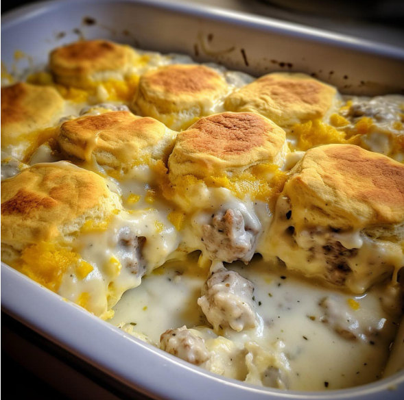 Zapiekanka śniadaniowa z ciasteczkami i sosem, kiełbasą i jajkami – Ta zapiekanka śniadaniowa to danie obowiązkowe na każdą okazję, od dużego świątecznego przyjęcia, przez brunch, po proste niedzielne śniadanie.
