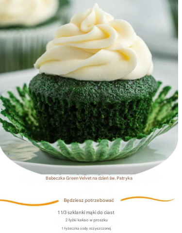Cupcakes Green Velvet to wyjątkowa, świąteczna wariacja na temat klasycznego red velvet. Ich intensywnie zielony kolor od razu przyciąga wzrok i sprawia, że idealnie wpisują się w klimat Dnia Świętego Patryka. To deser, który nie tylko świetnie wygląda, ale także zachwyca smakiem i aksamitną konsystencją.